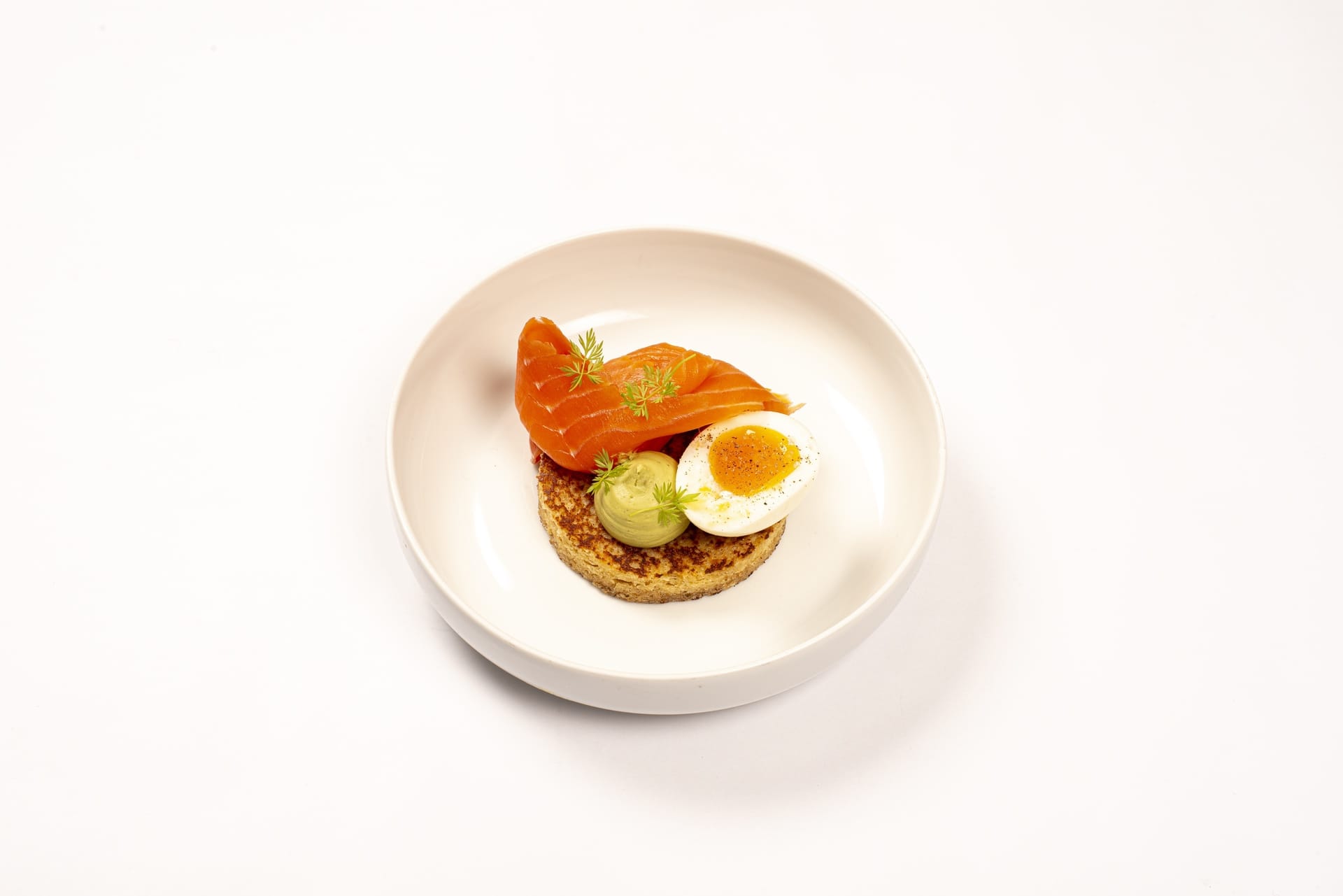 Sur la tranche de brioche, dresser la crème d'avocat à la bergamote, un demi-œuf mollet salé et poivré et une belle tranche de truite fumée. Décorer de cerfeuil.