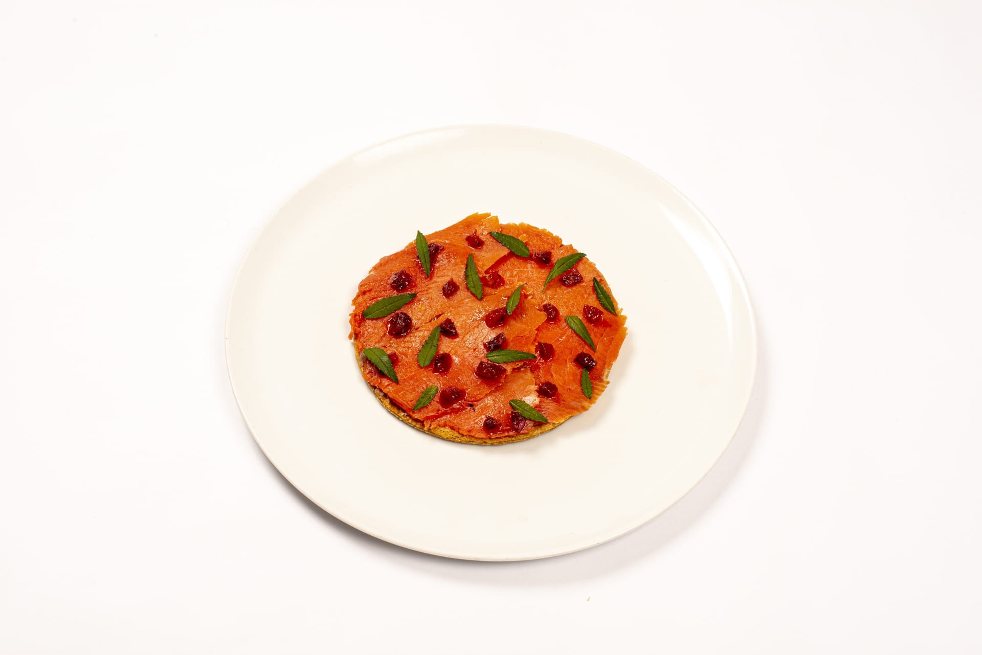 Etaler la crème (cream cheese, crème et jus d’orange) sur la pâte feuilletée. Recouvrir de tranche de saumon rouge fumé sauvage bien à plat. Ajouter les segments d'orange sanguine et décorer de pousses de feuille de tagète.
