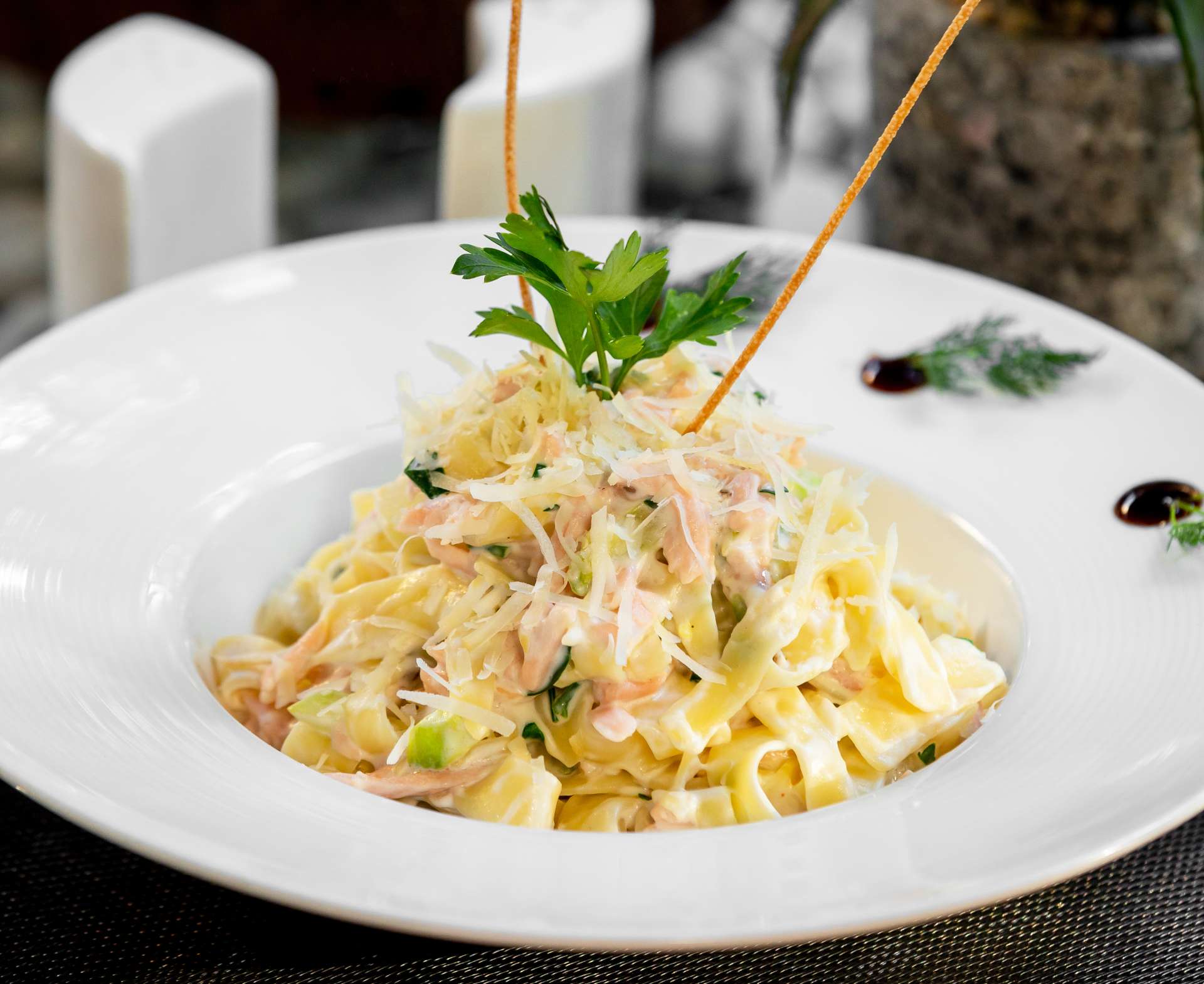 Dans une grande assiette, disposer les tagliatelles cuites. Verser la sauce au saumon et à l'avocat par-dessus les pâtes.
