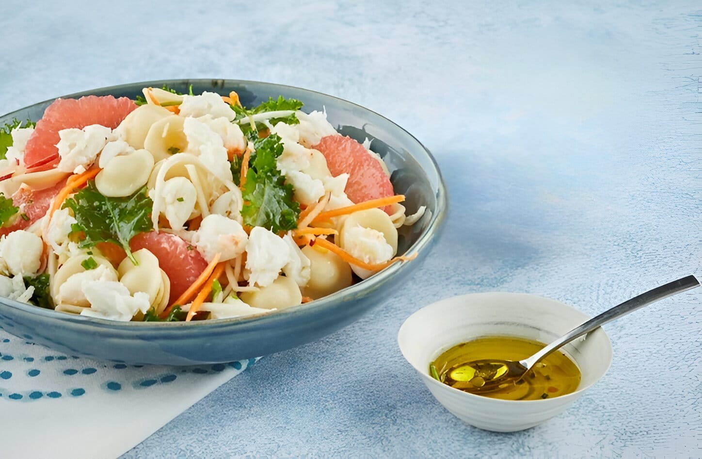Dans un saladier, déposer les pâtes, les légumes râpés, les suprêmes de pamplemousse et la cebette ciselée. Ajouter les bâtonnets de pomme. Mélanger. Ajouter le Crabe Chair et Pattes, les feuilles de kale et mélanger. Parsemer de feuilles de persil et de coriandre.